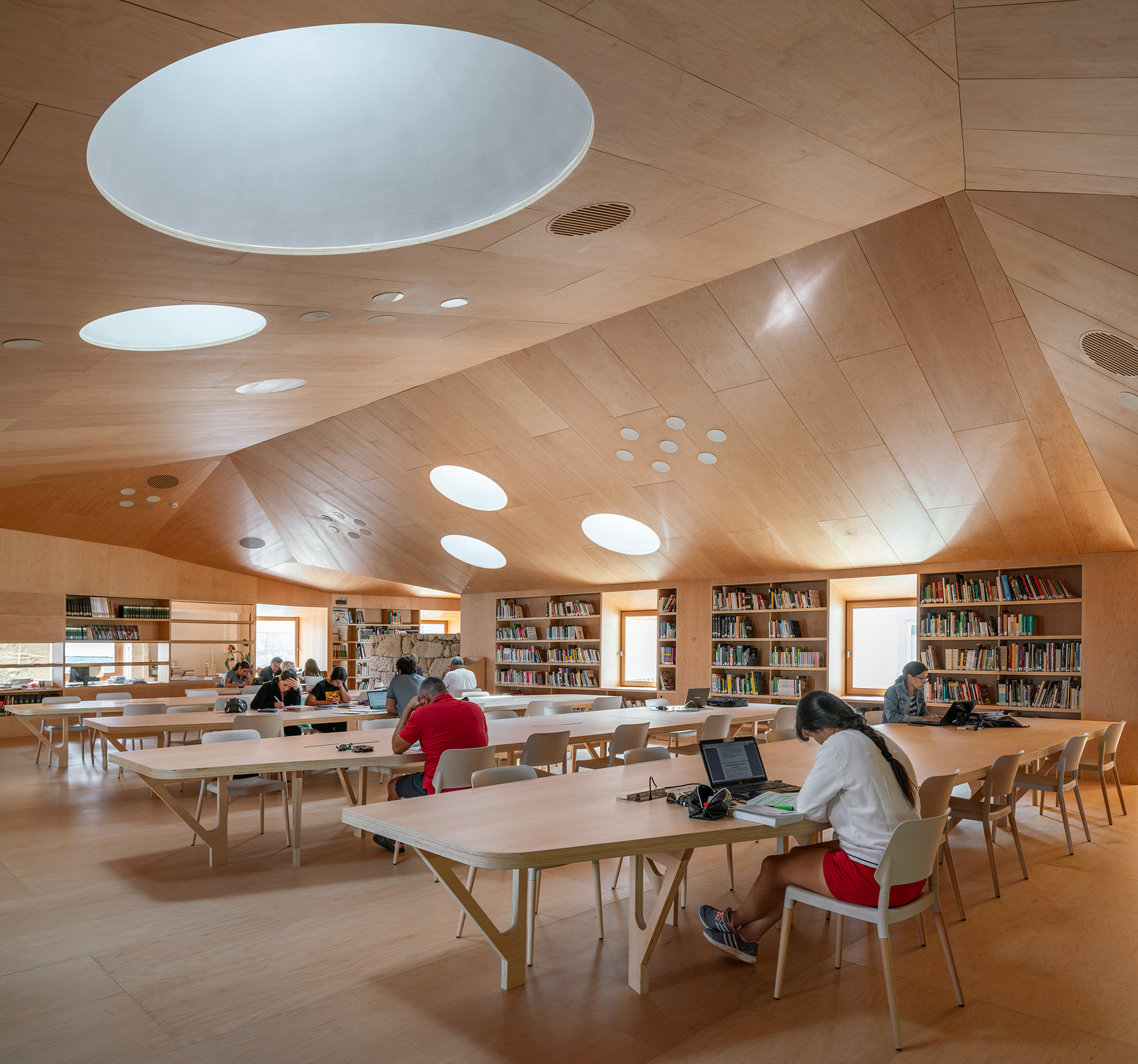 A organización de planta primeira tamén para a sala de lectura, que discorre sen interrupcións ao seu ao redor. Unha dobre envolvente de madeira de arce delimita por completo esta sala e xera unha banda funcional concéntrica de espazos interticiais como cabinas de estudo individual, aseos, despachos e área de lectura informal. O solo está resolto co mesmo material que os paramentos verticais, así como a cuberta interior, que se triangula para adaptarse ás necesidades técnicas e dimensionais da estrutura e as instalacións.