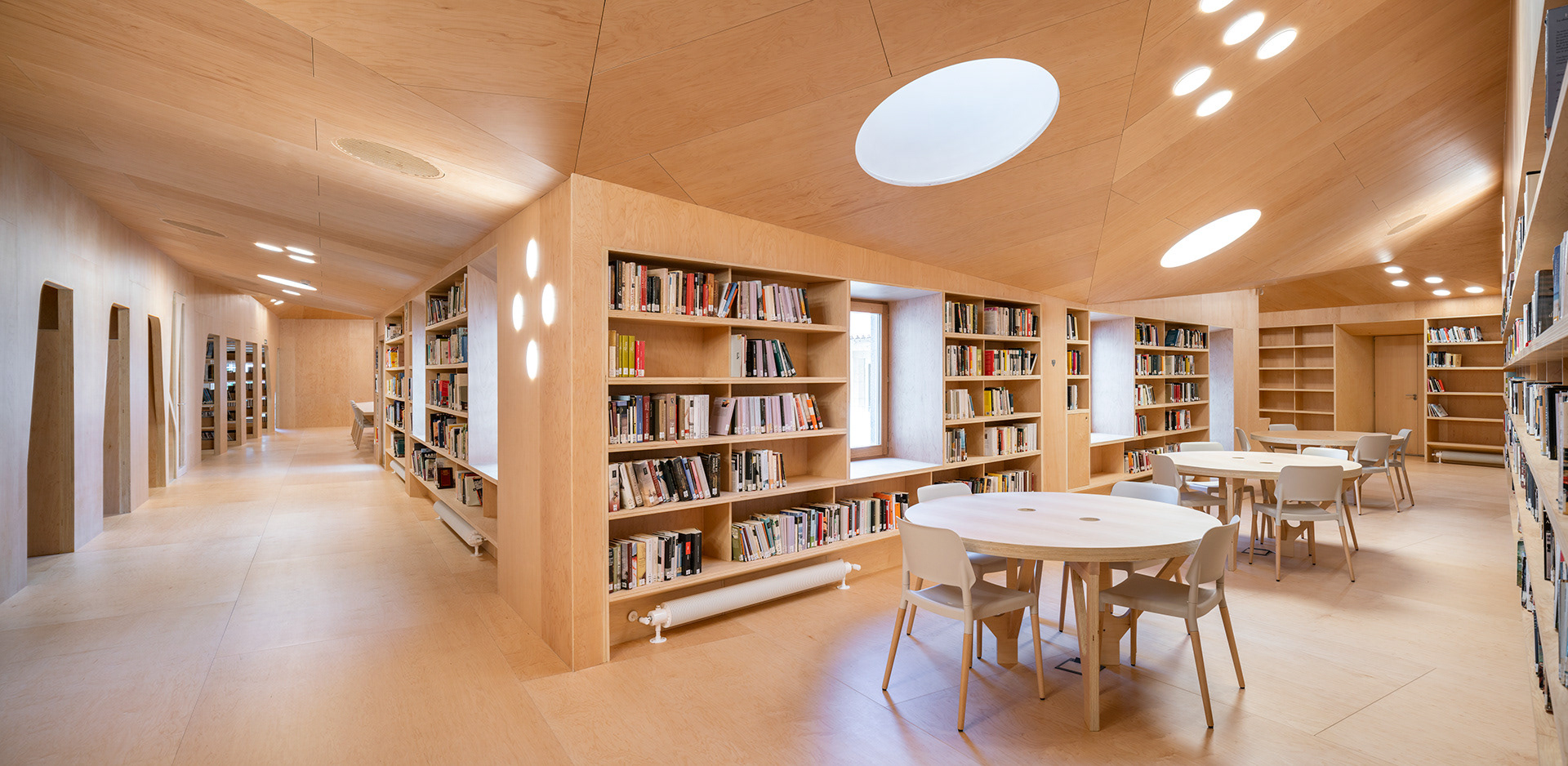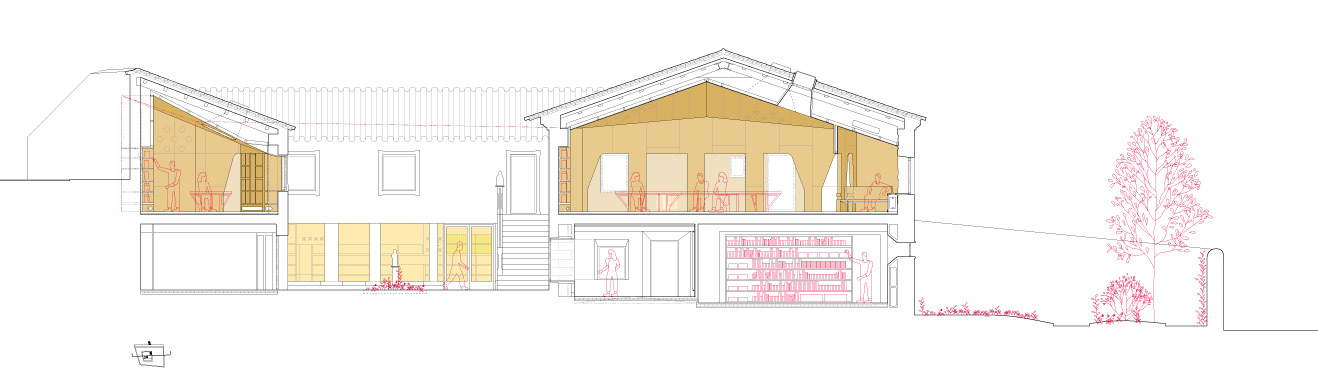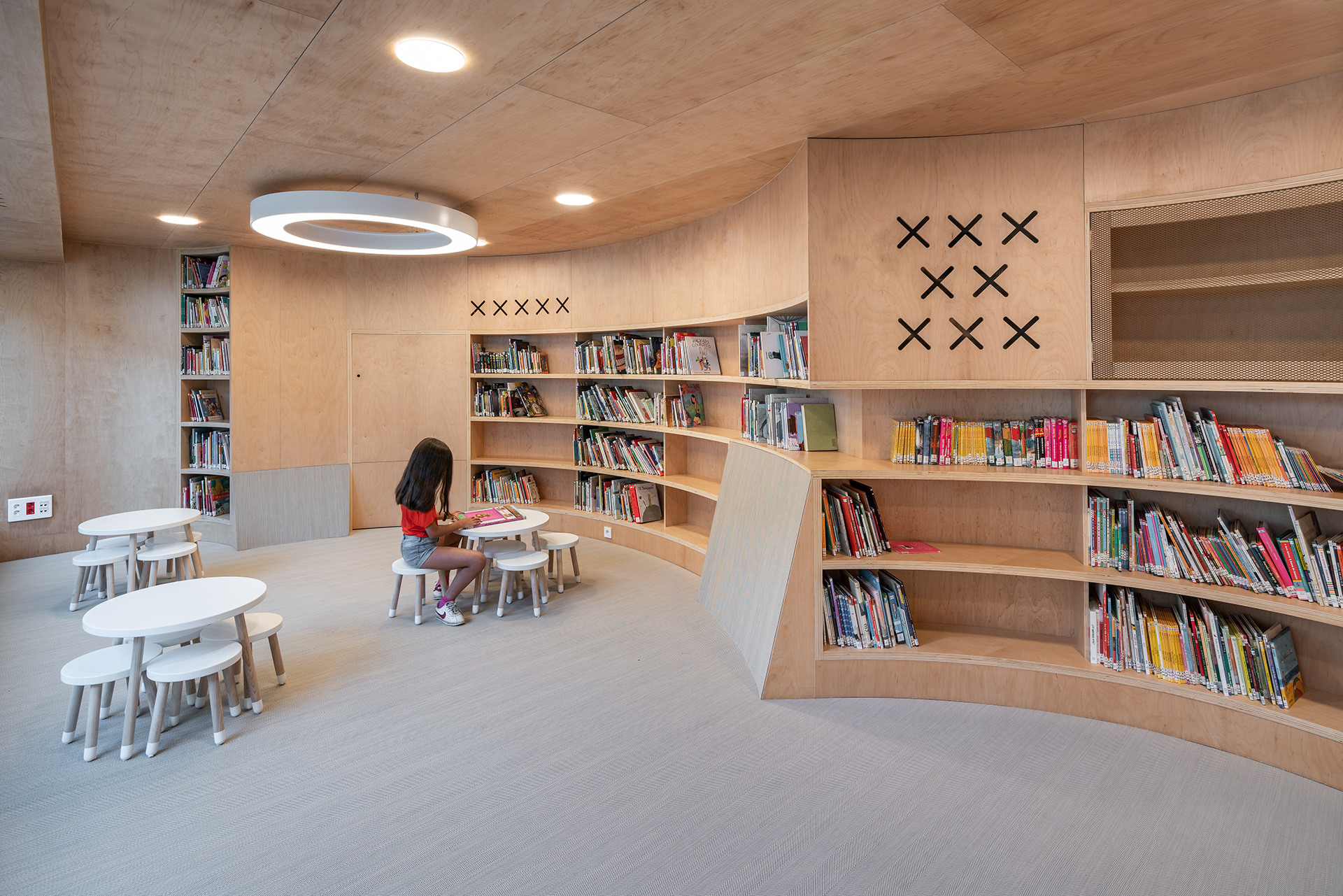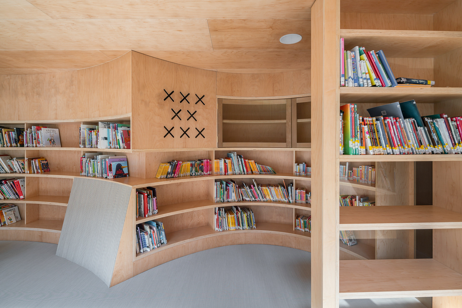 A sala polivalente e a biblioteca infantil ábrense directamente ao patio e a súa actividade pode estenderse ao exterior. Unha serie de curvas de distintas aperturas definen o perímetro da sala infantil para adaptarse á fragmentada xeometría orixinal e conferirlle unha identidade propia. Este paramento curvo incorpora as estanterías e deixa pequenos intersticios ocultos detrás da dobre pel de madeira, como un guiñol ou o gardarroupa.