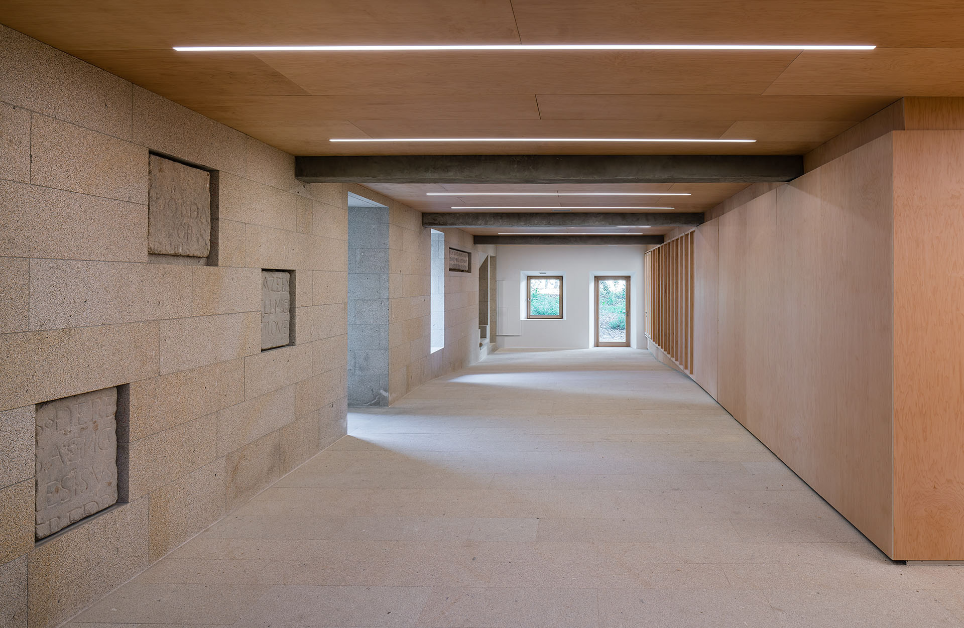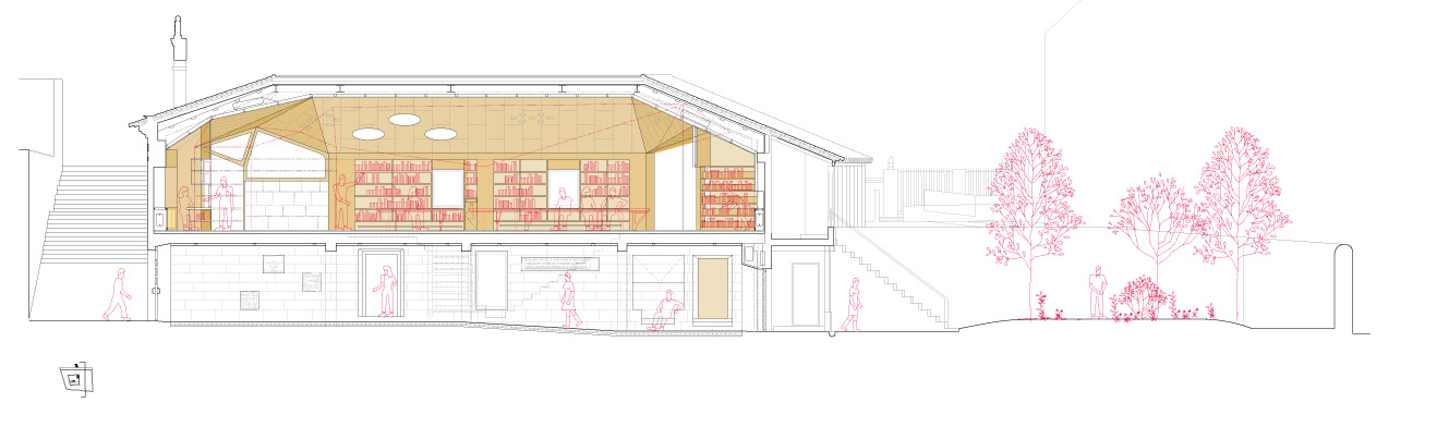 En planta baixa, un gran zaguán atravesa lonxitudinalmente o edificio e ordena todas as circulacións da biblioteca. Como unha rúa interior, comunica a entrada principal coa saída. Este groso muro de sillares de granito acolle as fiestras existentes, os accesos a outras estancias e un novo nicho para sentarse e reúne as diversas pezas arqueolóxicas halladas no edificio orixinal. Fronte a el, un volume de madeira agrupa o programa de Arquivo Municipal, os servizos e o ascensor.