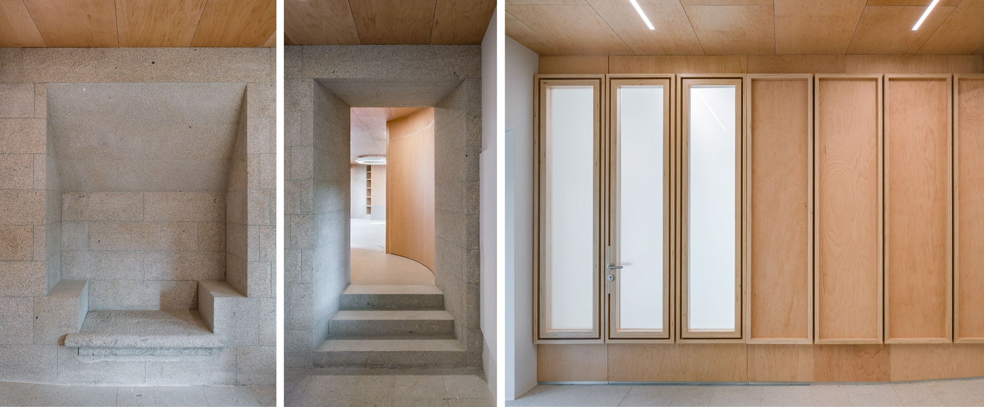 O grosor deste porche evidénciase nos lucernarios de cuberta, grandes troncos de cono brancos e, nas salas perimetrais, que, como os antigos gabinetes de lectura relixiosa, adósanse á fachada do vello edificio.