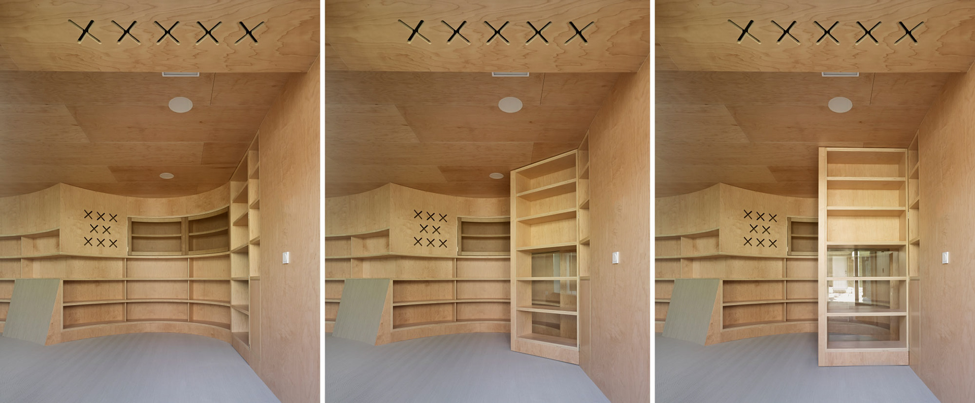 A porta de entrada desde o zaguán de acceso é unha grosa estantería pivotante, unha porta segreda que queda integrada co resto de estanterías cando está pechada. Paredes e teitos, tamén de madeira, perfóranse cunhas aspas para resolver as tomas de ventilación. Os nenos poden sentarse no solo, terminado cun material téxtil, que se plega sobre os paramentos verticais para formar pequenos planos inclinados sobre os que recostarse.